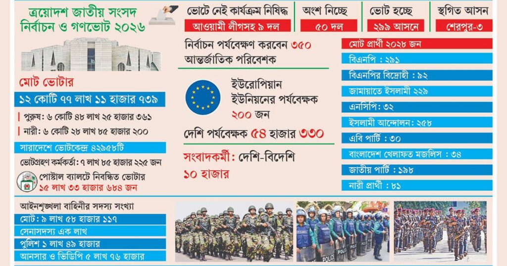 আজ ত্রয়োদশ জাতীয় সংসদ নির্বাচন অনুষ্ঠিত হচ্ছে, যা দেশের রাজনৈতিক ইতিহাসে একটি গুরুত্বপূর্ণ মুহূর্ত। গণঅভ্যুত্থানের পর থেকে পরিবর্তিত পরিস্থিতিতে এই নির্বাচন নতুন এক দিক নির্দেশনা দিচ্ছে। এবার প্রথমবারের মতো একই দিনে ভোটাররা ভোট দেবেন সংসদ সদস্যদের নির্বাচনের পাশাপাশি দেশের বিভিন্ন সংস্কার ও উন্নয়নমূলক প্রশ্নের পক্ষে বা বিপক্ষে রায় দিতে। এই নির্বাচনে নিরাপত্তা ব্যবস্থা এতটাই কঠোর […]