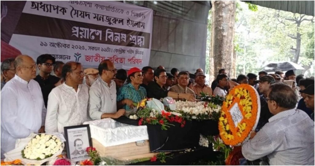 শেষযাত্রায় সহকর্মী ও বিভিন্ন সামাজিক সংগঠনের সদস্যরা শ্রদ্ধা ও ভালোবাসায় ভাসলেন লেখক ও শিক্ষাবিদ সৈয়দ মনজুরুল ইসলামের अंतिम বিদায় অনুষ্ঠানে। তার মৃত্যুতে শুধু পরিবার-পরিজনই নয়, বিপুল সংখ্যক সহকর্মী, ছাত্র, সরকারী পরামর্শদাতা, লেখক, রাজনীতিবিদ ও বিভিন্ন সামাজিক সংগঠনের নেতৃবৃন্দও শোকের ছায়া নেমে আসে। শনিবার (১১ অক্টোবর) সকাল ১১টায় কেন্দ্রীয় শহিদ মিনারে তার মরদেহ প্রথমে রাখা হয়, […]